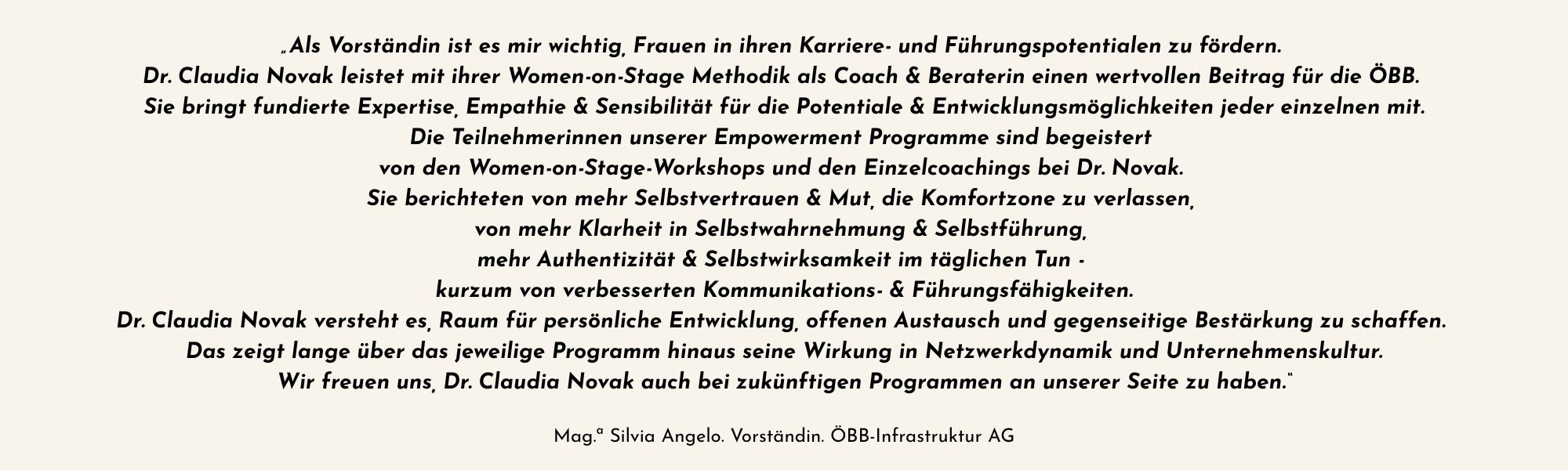die einzigartige Kombination aus Empowerment, Persönlichkeitsentwicklung, strategischer Kommunikation & Rhetorik. Das FEM-P&L Programm begleitet Frauen gezielt und nachhaltig auf die vielen Bühnen des Unternehmens-Alltags und ermöglicht einen individuell persönlichen und gleichzeitig gemeinsamen & verbindenden Prozess für alle: